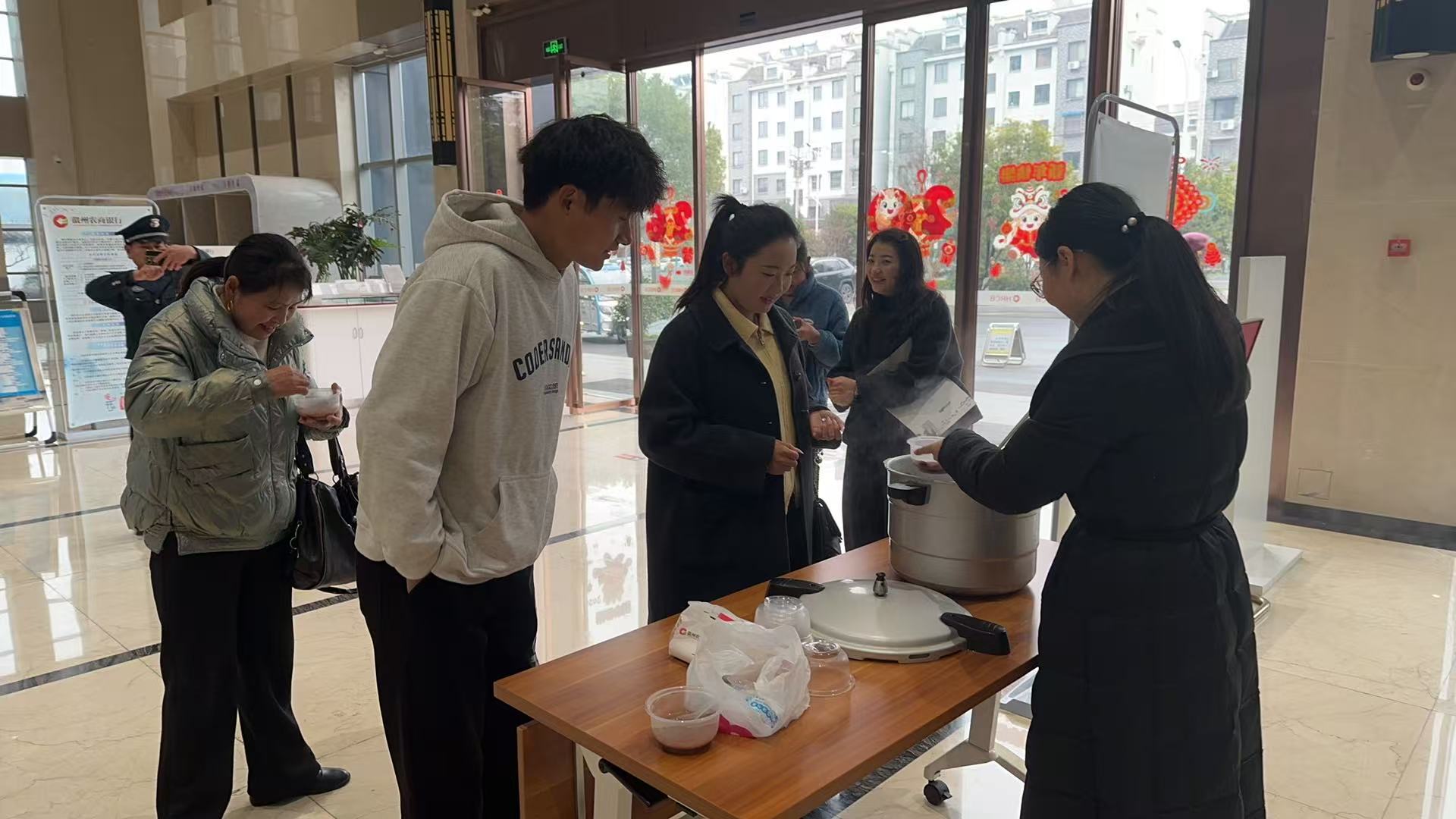 活动当日,营业部大厅内洋溢着浓厚的节日氛围,空气中弥漫着糯米、红豆、莲子、桂圆与徽州特色果脯交融的香甜气息。从清晨营业伊始,前来办理业务的市民便陆续领到这份暖心馈赠,老年客户接过热粥时眼角的笑意,上班族匆忙中的驻足品尝,户外工作者避风时的片刻休憩,都让厅堂成为传递温情的枢纽。