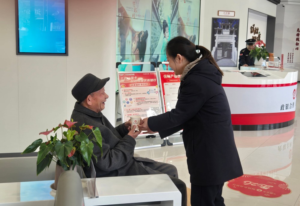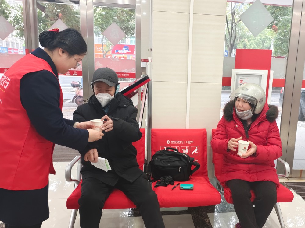 (图为六尺巷支行工作人员为厅堂老年客户提供热水。方琳摄影)
