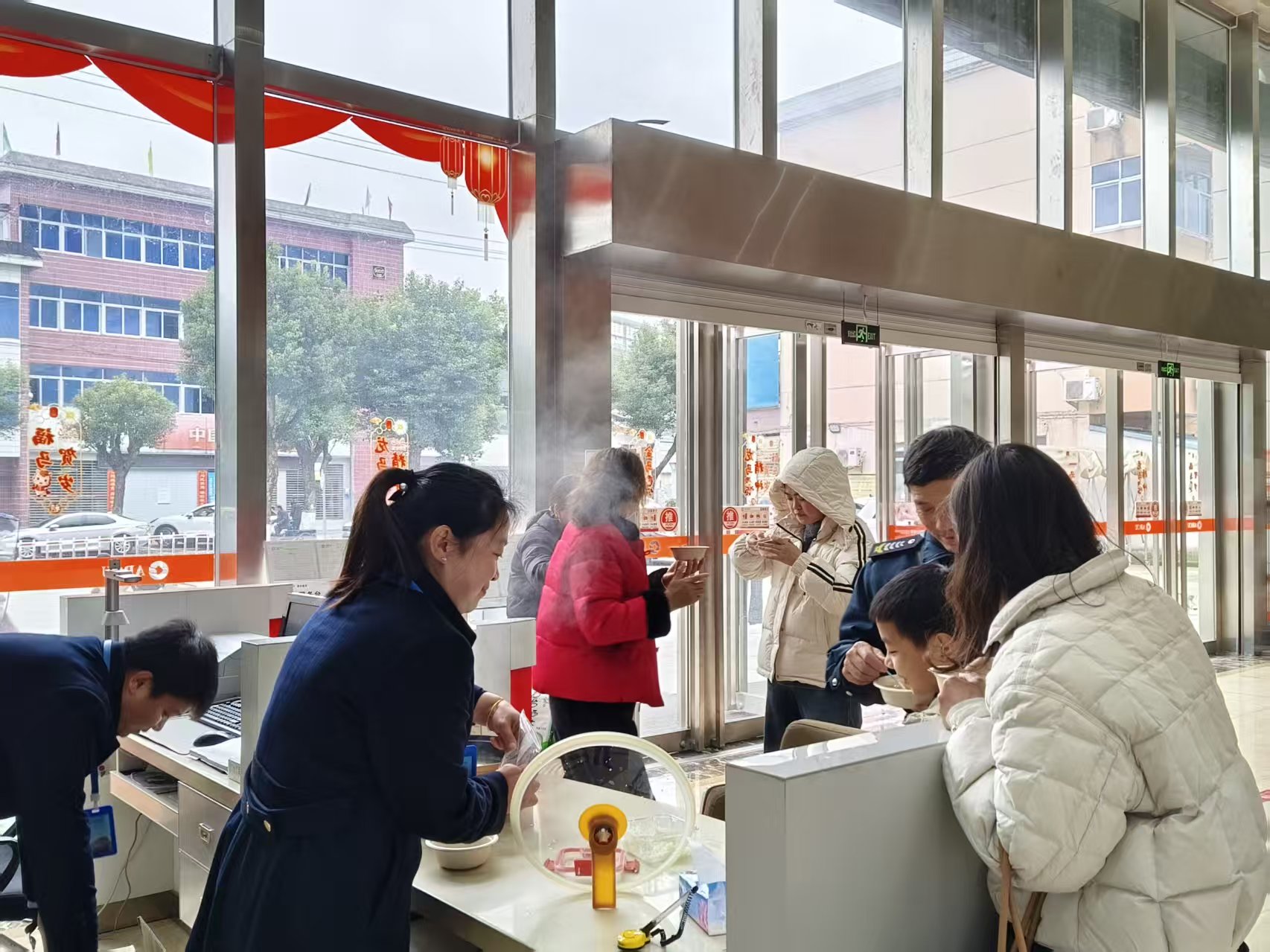 活动现场,一碗碗热气腾腾的汤圆香气四溢,一声声“元宵快乐”的祝福真挚暖心,工作人员不仅将团圆暖意传递给厅堂客户,更将关爱延伸至网点周边环卫工人、辖区孤寡老人等困难群体,让金融服务的温度与深度,在元宵佳节的烟火气中悄然传递、浸润人心。