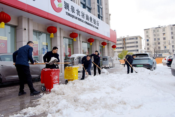近日阜阳市迎来低温冰冻天气,大雪降临,道路结冰,为保障附近市民及员工出行,颍泉农商银行积极响应市区政府号召,组织开展铲冰除雪志愿服务活动,为大家出行安全添一份力量。
