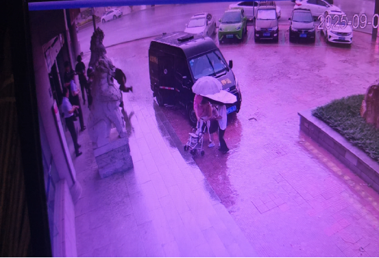 就在库车抵达支行门口、员工们准备配合交接工作时,外出办理业务返回的员工孙慰心突然注意到,不远处的人行道上有两位老人正冒着暴雨艰难前行。其中老奶奶拄着拐杖,步伐蹒跚,老爷爷则试图用单薄的外套为老伴遮挡雨水,两人的衣服早已被狂风暴雨淋得湿透。见此情景,孙慰心立刻转身冲进支行大厅,取来一把雨伞,毫不犹豫地再次冲进暴雨中,快步跑到两位老人身边。