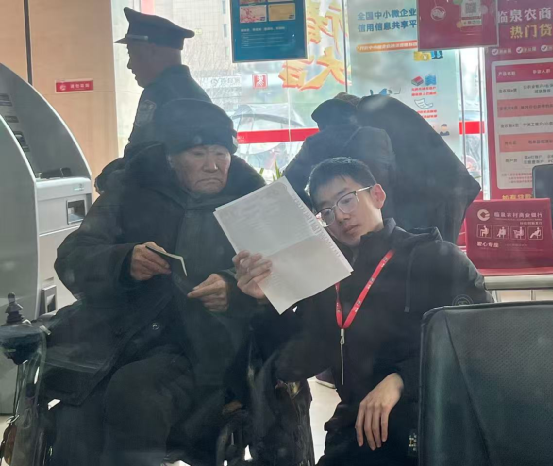 近日,临泉农商银行科创支行营业大厅内迎来一位特殊的客户,大爷坐着轮椅,手里拿着银行流水单,面露难色。正在厅堂值守的工作人员了解情况后,第一时间引导大爷至休息区。