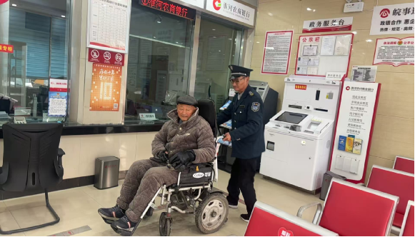 当日,一位行动不便的老人在家人陪同下,来到该网点办理养老保险支取业务。因腿脚不便,老人行走困难,步履蹒跚。这时正在大堂执勤的保安人员发现后,立即主动上前询问情况,随即从网点便民服务角推来轮椅,与大堂经理一同小心翼翼地将老人搀扶至轮椅上。大堂经理耐心询问老人的业务需求,得知老人需通过智能柜员机支取养老保险后,考虑到老人对智能设备操作不熟悉,便全程陪同引导。