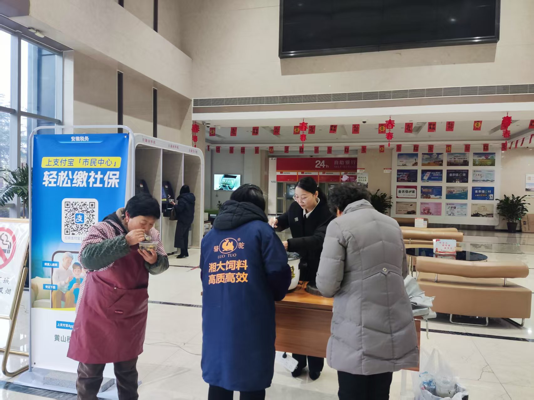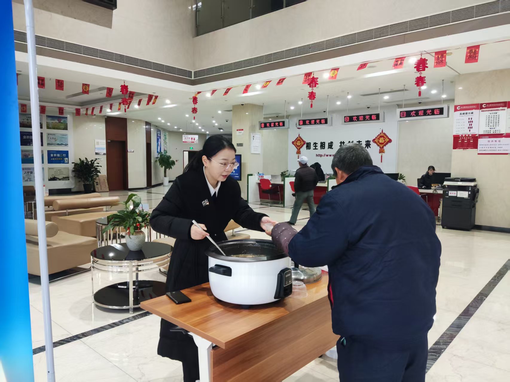 活动当日,营业部大厅内洋溢着浓厚的节日氛围,空气中弥漫着糯米、红豆、莲子、桂圆与徽州特色果脯交融的香甜气息。从清晨营业伊始,前来办理业务的市民便陆续领到这份暖心馈赠,老年客户接过热粥时眼角的笑意,上班族匆忙中的驻足品尝,户外工作者避风时的片刻休憩,都让厅堂成为传递温情的枢纽。
