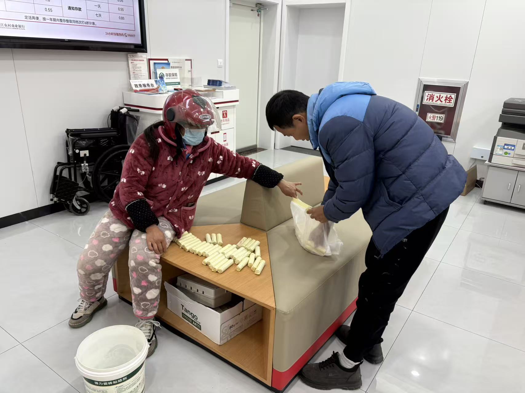 近日,家住毛桥村的赵女士带着积存一年的两千多元硬币到铜陵皖江农商银行流潭支行兑换,恰逢水浒村经营超市的姚先生正为零币短缺发愁。了解到这一情况,支行员工主动联系双方对接,一边安抚赵女士情绪并承诺优先处理,一边邀请姚先生前来。