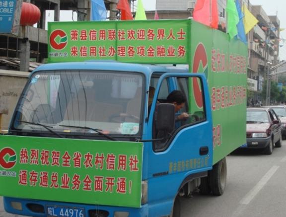 日前,萧县联社组织宣传车队走乡串村,把综合业务系统上线的喜讯传播到每家每户。该联社编发传单,在各乡镇广泛宣传农村信用社通存通兑业务开通的优势,宣传车队所到之处,受到当地人民群众的热烈欢迎。